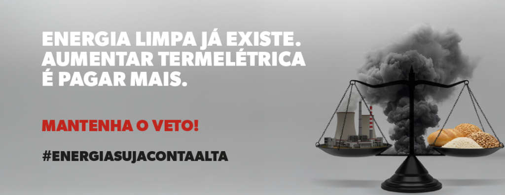 Sob o mote “Diga não às termelétricas. O Brasil merece energia limpa e barata”, a campanha “Energia Suja, Conta Alta” apresenta, com dados concretos, os impactos econômicos e sociais de uma eventual derrubada dos vetos. O uso de termelétricas eleva a inflação e compromete toda a cadeia produtiva: pão mais caro (+4%), cesta básica mais pesada (+6%)* e  aumento de 9% na conta de luz, conforme levantamento da Consultoria PSR.